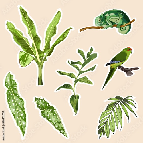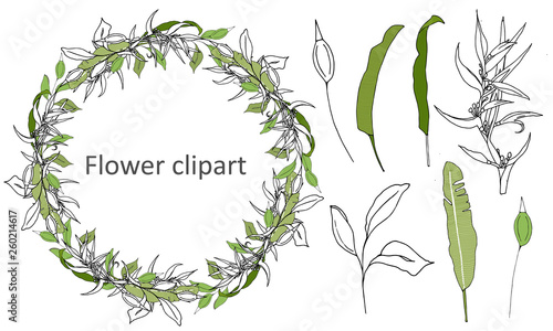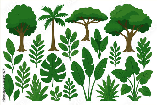 Tropical liana creeper plant decorative elements set, flat vector illustration isolated on white background. Hanging jungle vine brunches, climbing green plants, monstera frame.