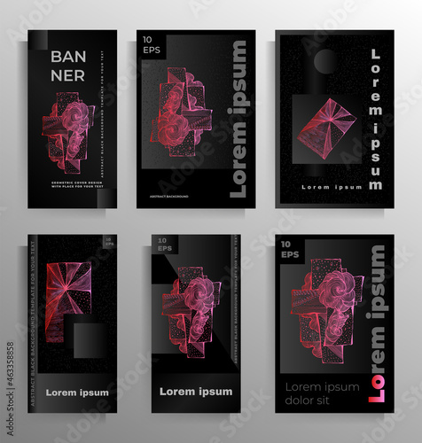 Tropical neon card template set, vector isolated illustration. Abstract composition of different neon frames and exotic palm tree, monstera, jungle plant leaves.