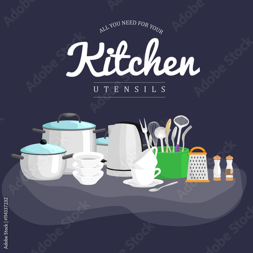 Coffee production vector flat illustration. Turkish cezve pot, hand putting lid on glass pitcher, grinder, cup of hot drink, croissant. Turkish coffee making equipment and accessories poster, banner.