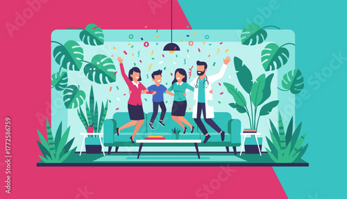 Television news vector poster template. Young woman watching the latest tv news program while sitting on sofa at home. Journalist with mic and cameraman going to take interview for print newspaper etc