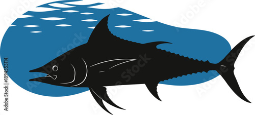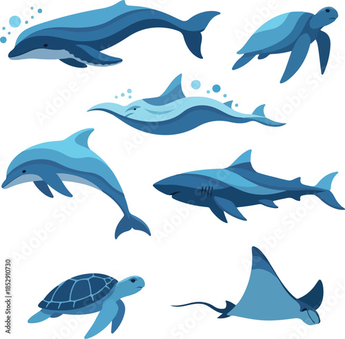 Two dolphins blue silhouette isolated on white background. Vector illustration design in paper cut style. Fish and underwater sea life double exposure.