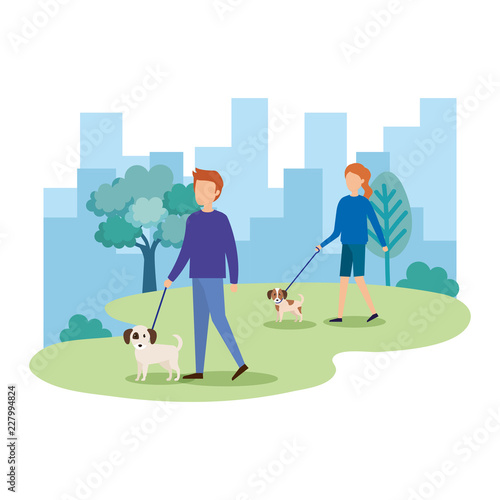 Two happy girls taking selfie, flat vector illustration. Young women, best friends walking in city park together with pet dog. Female friendship.
