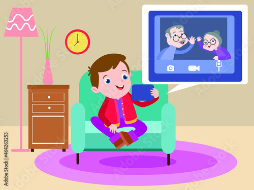 Kids play video game console on tv vector illustration. Computer room for gamer. Two young boys player looking at television screen having fun gaming activity at home