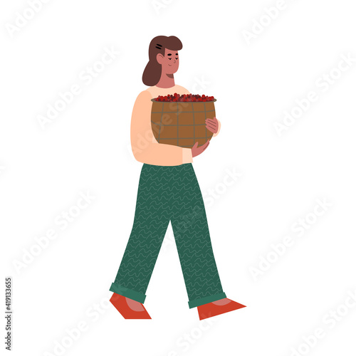 Two men gardeners carrying wooden crate with apple fruit vector icon isolated on white background.
