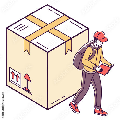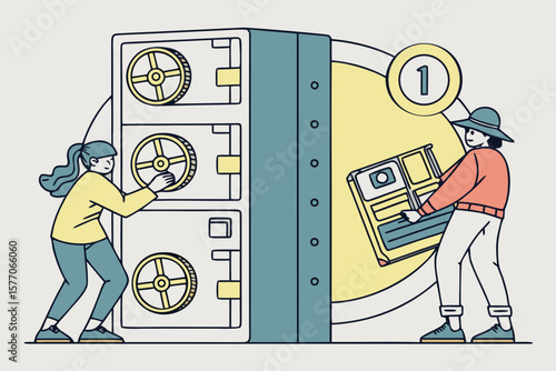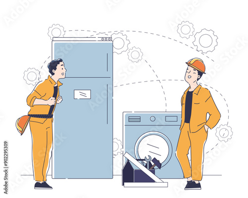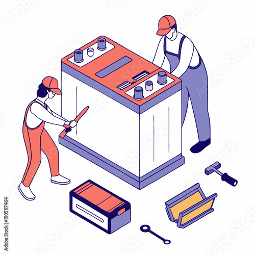 Two movers carrying closet, flat vector illustration. Relocation. Moving company service. Furniture delivery.
