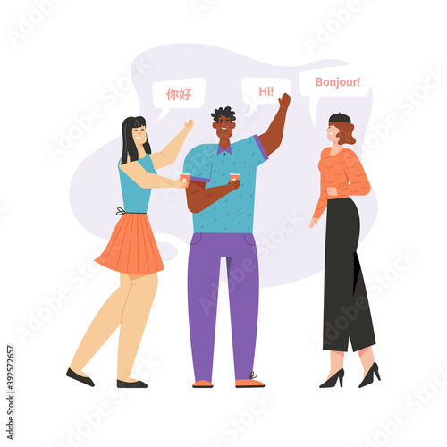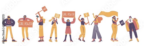 Two strong diverse girls with raised fist and female gender sign, flat vector illustration. Women Equality Day, women empowerment, girl power, feminism concept.