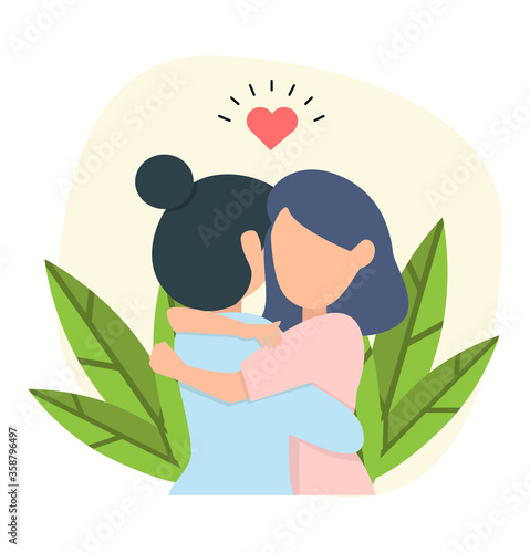 Two women couple connecting heart halves vector scene. LGBT couple reconciliation and self acceptance concept. Happy females standing and hugging near big broken red heart illustration