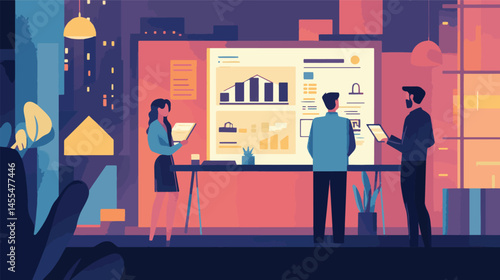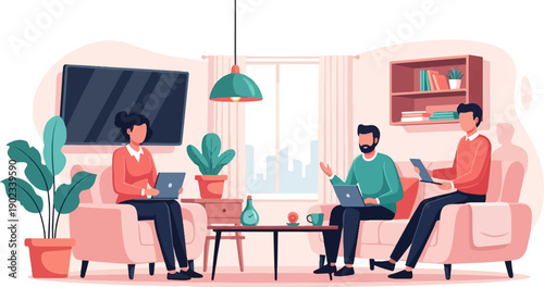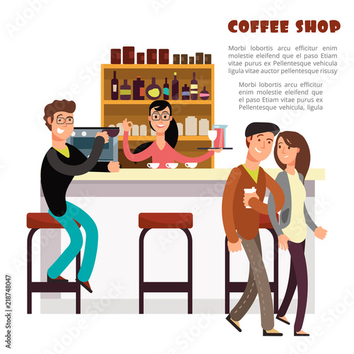 Two young men sitting at bar counter, talking and drinking beer after work, vector flat illustration. Happy male best friends meeting in cafe, beer pub. Man friendship, friday meeting.
