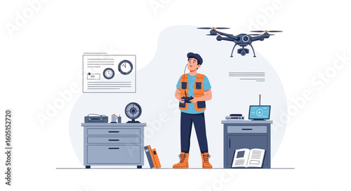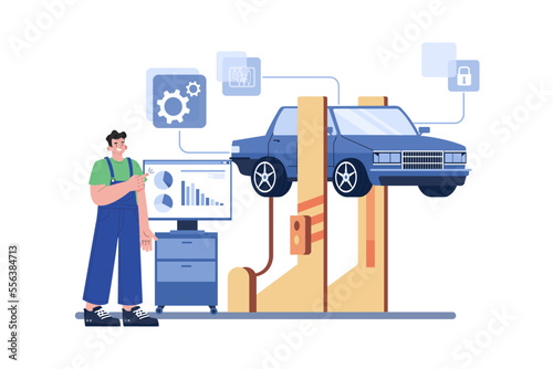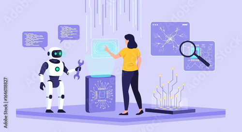 Typography services, vector illustration. Printing process with huge offset printers and micro male and female characters workers. Printing house composition for web banner, website page etc.
