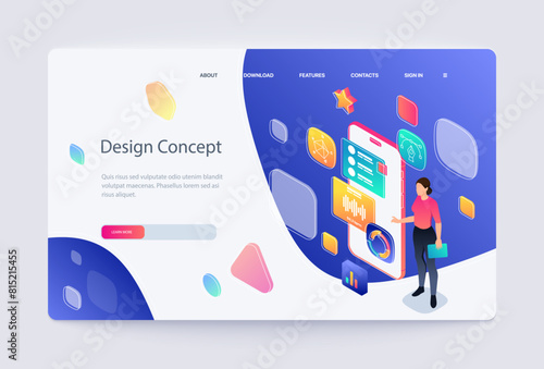 Ultra marathon run and sport goal. Healthy food diet mobile phone app. Vector web site design template. Landing page website isometric concept illustration