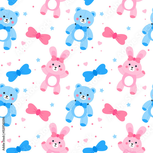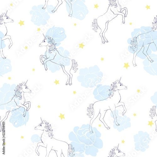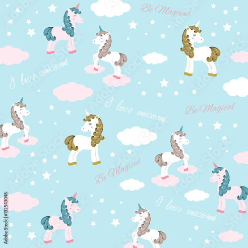 Magic unicorn seamless pattern. Vector hand drawn flying on balloons romantic unicorns with rainbows and clouds.
