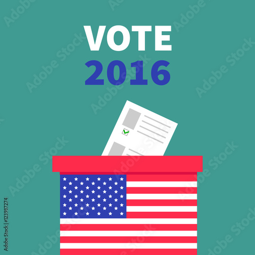 USA presidential election day concept vector illustration. Hand putting voting paper in the ballot box with american flag on background. Voting concept in flat style.