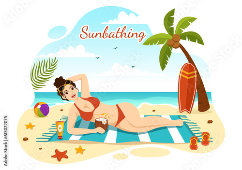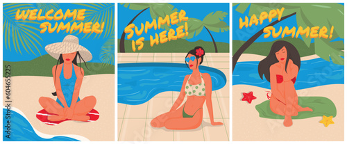 Vacation landing page design, website banner template set, flat vector illustration. Woman making sand mermaid. Beach accessories. Summer beach holidays.