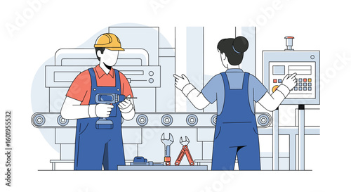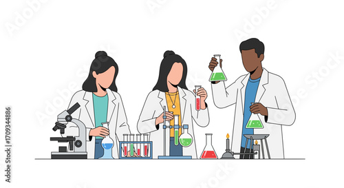 Vaccine research, flat vector illustration. Group of medical scientists in lab coats, face masks and glasses working in science laboratory developing vaccine against coronavirus disease Covid-19.