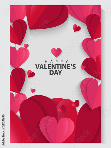 Valentines Day sale social media story, post vector template. Paper cut craft style heart shape hot air balloons with gift boxes flying in the sky. Creative composition for poster, banner, cover, card