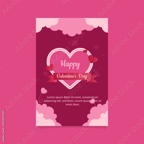 Valentines Day social media story, post vector template. Paper cut craft style hearts flying high in the sky. Romantic love creative composition for poster, banner, cover, card.
