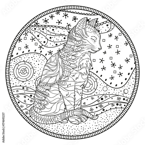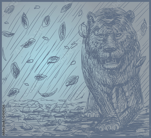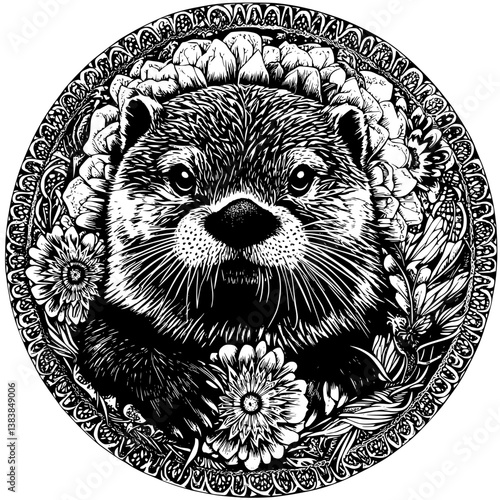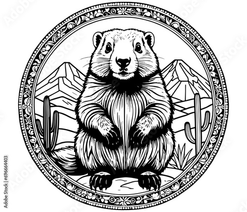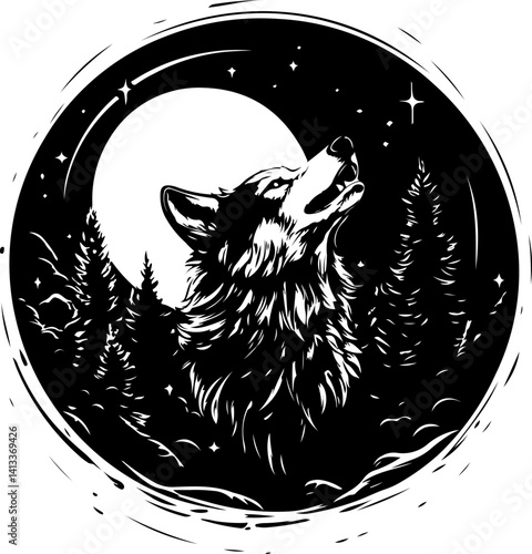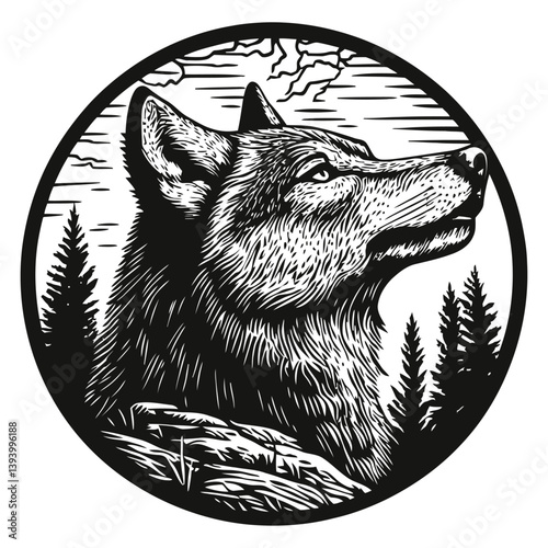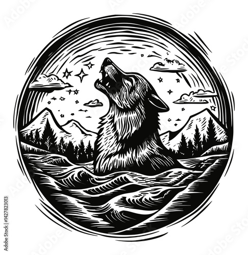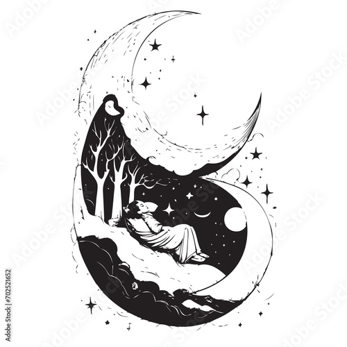 Vector animal tattoo or t-shirt print design. Bear head combined with nature in round frame with moon phases.
