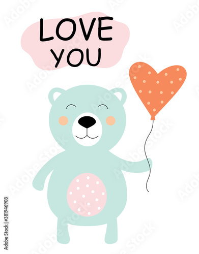 Animal with love vector. Teddy bear with heart shape air balloon icon illustration. Sweet happy character for valentine, birthday or wedding postcard romantic poster design. Isolated on white