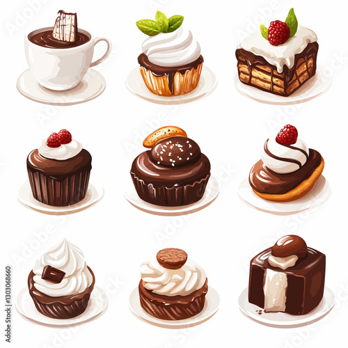 Chocolate muffin vector icon set. Realistic chocolate cupcakes, pastry with whipped cream isolated on white background.