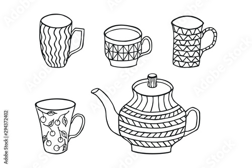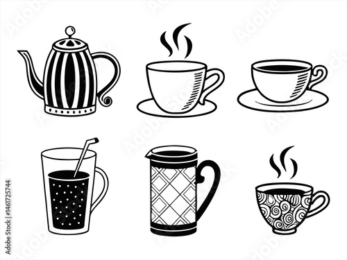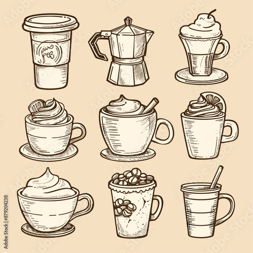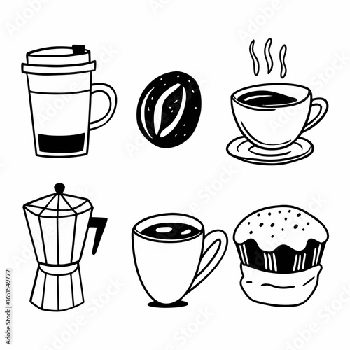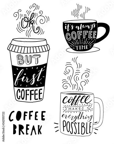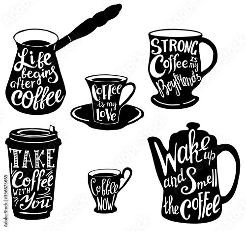 Vector coffee set with handwritten inspirational and funny coffee quotes and sayings. Vintage creative white on chalkboard typography design for coffee shop and print.
