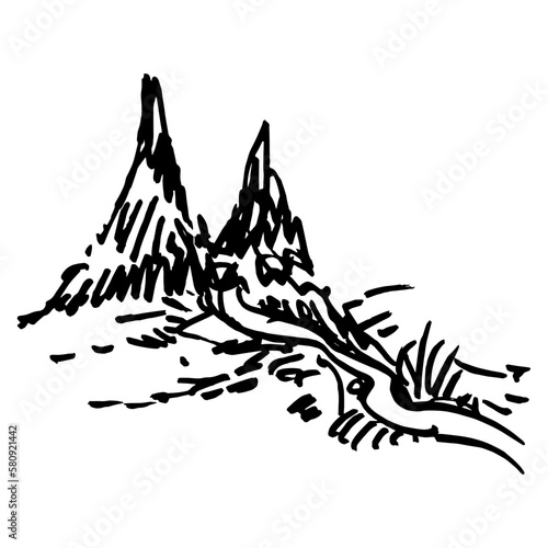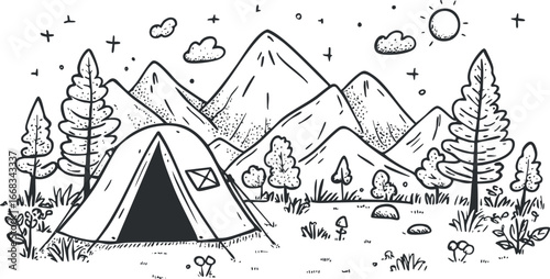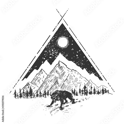 Tiger tattoo art style. Vector geometric tattoo sketch. Vintage hand drawn tiger, mountains, forest, compass star, crossed arrows.