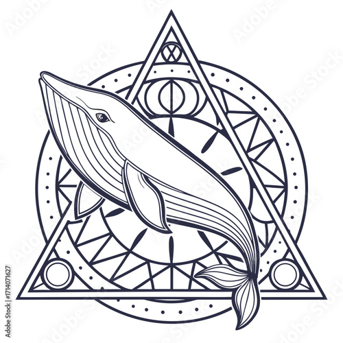 Whale tattoo art style. Vector geometric tattoo sketch. Vintage hand drawn ocean whale, symbol of good luck, awareness and wisdom.
