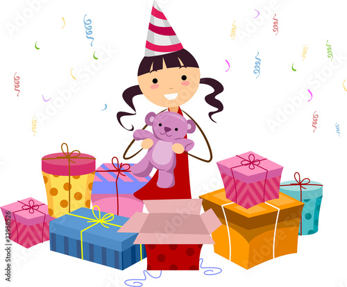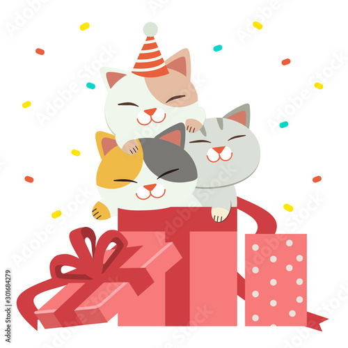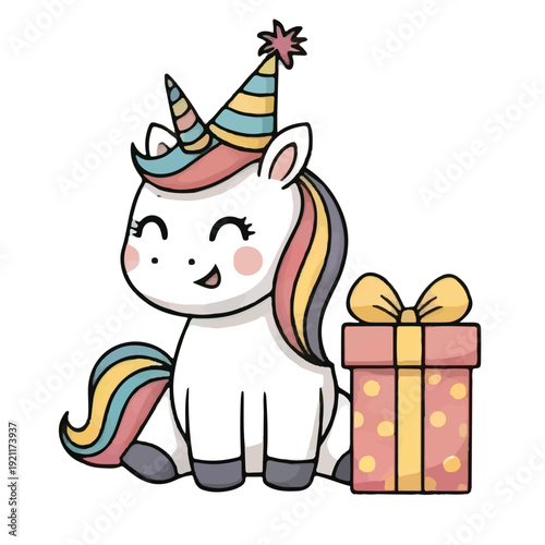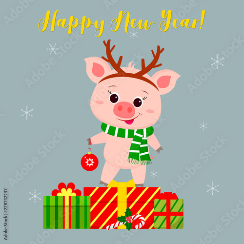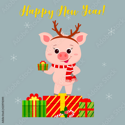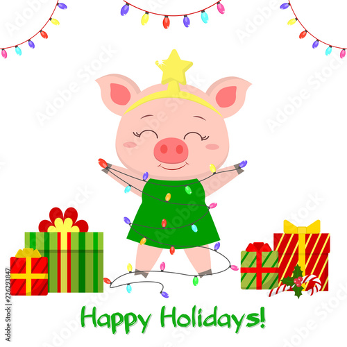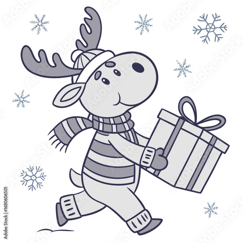 Vector cute Christmas rabbit. Cartoon card with happy winter character. Happy holiday celebration. Xmas and new year greeting postcard. Doodle hare in garland standing near gift box