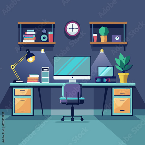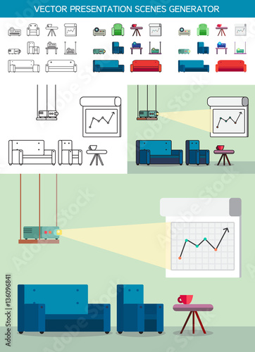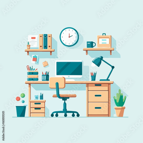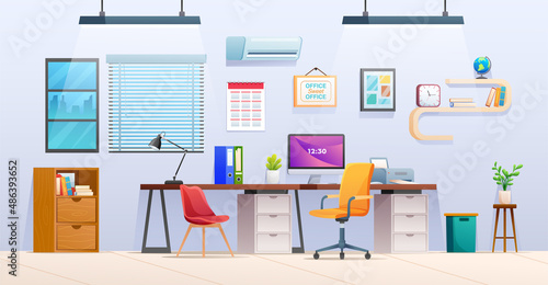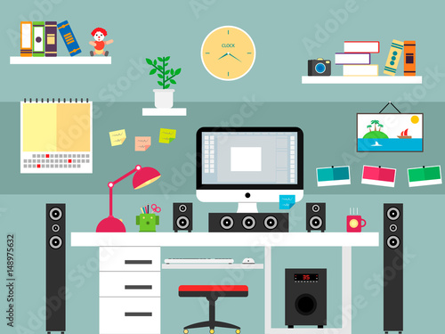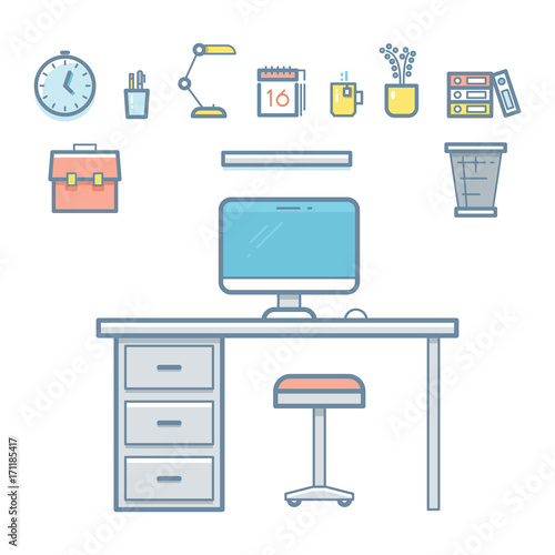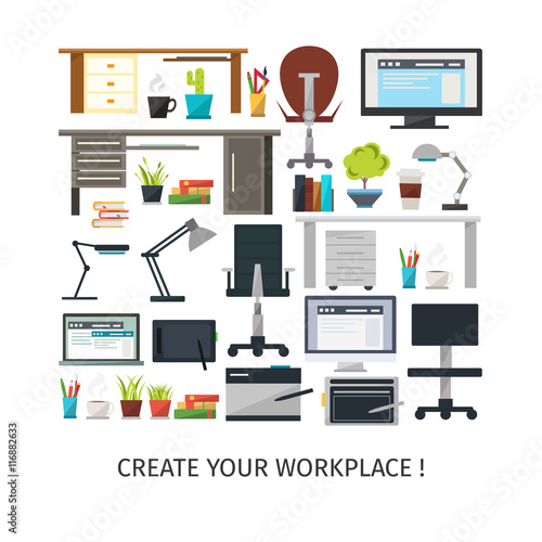 Vector design concept for working places. Set of office desks and spaces, programmer and developer, copywriter, designer. Office interior and icons in flat style.