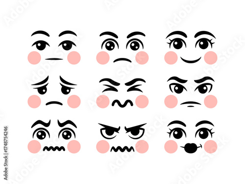 Red heart female character emoji maker, smiley creator. Vector set of emoticon face parts and accessories such as glasses, bow, flower for your own cool feminine heart emoji creation.