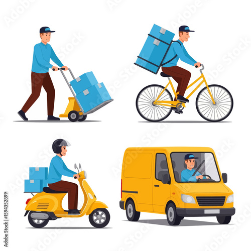 Vector icons set of food delivery profession people isolated on white background. Couriers delivering food by foot, by bicycle, truck and by scooter flat style design elements.