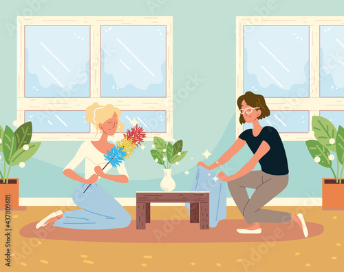 Vector illustration of cleaning woman ironing clothing with steam iron. Cleaning company services concept design element in flat style.