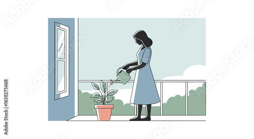 Vector illustration of cleaning woman or housewife listening to radio while washing flooring with sponge mop. Radio station concept design element in flat style.