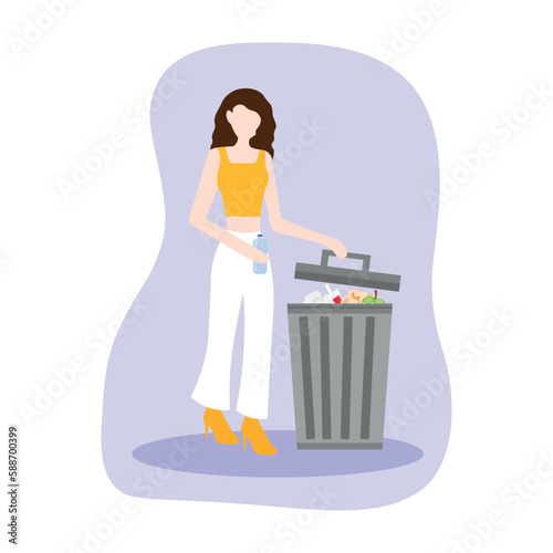 Paparazzi photographer young girl taking photo of famous person or people while hiding behind of garbage can standing next to building wall. Vector flat style design illustration.