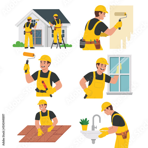 Vector flat isometric renovation poster, banner template set. Painting walls, preparing foundation, installing laminate and electric sockets using home repair tools concept design elements, icons.