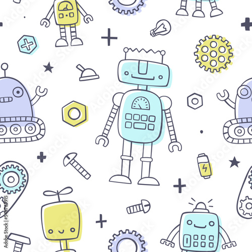 Vector seamless pattern with decorative baby symbols, icons. Newborn baby background, wrapping paper texture thin line art flat style design.