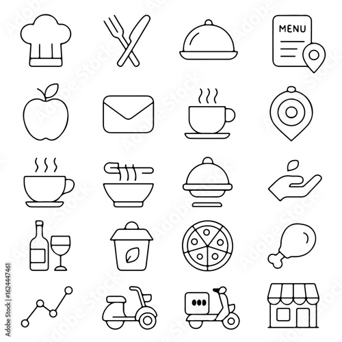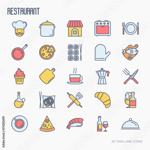 Vector seamless pattern with decorative restaurant service, food, tableware symbols, icons. Restaurant background, wrapping paper texture thin line art flat style design.