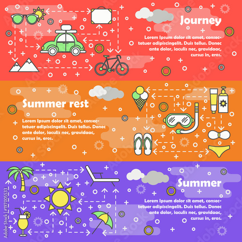 Vector set of horizontal banners with Journey, Summer rest and Summer line art flat style design elements, web templates.