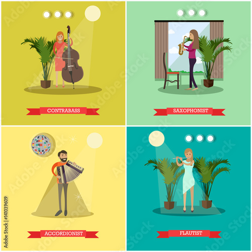 Vector set of posters with musicians male and female playing musical instruments. Contrabass, Saxophonist, Accordionist and Flautist flat style design elements.