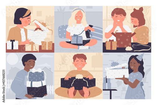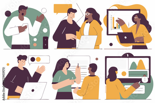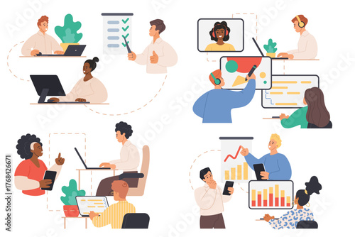 Vector flight attendant serving elderly couple passenger on air plane during aircraft travel illustration. Stewardess character working, hostess offers food drink background
