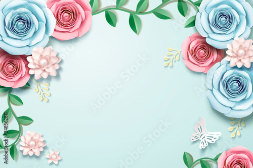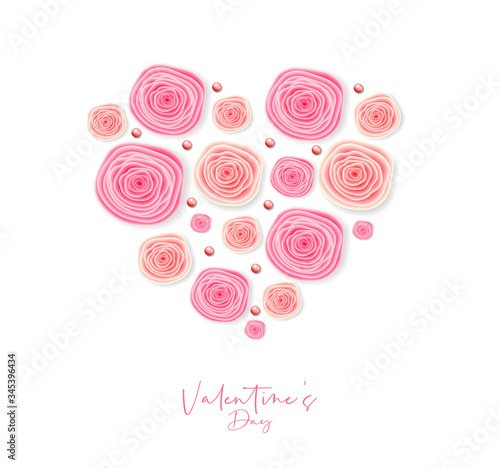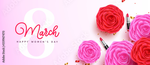 Happy Womens Day, vector floral greeting card design in paper art style. 8 March festive paper cut background with pink roses.