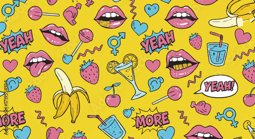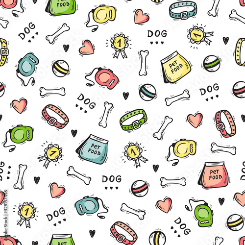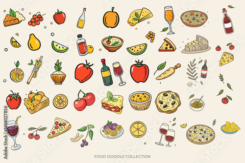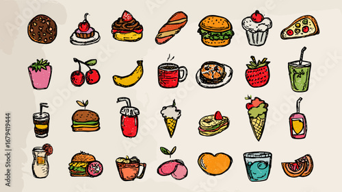 Vector food and drink icon set and seamless pattern with vegetables, meat, fish, cheese, milk, oil bottle, mushrooms and eggs. Healthy eating concept hand drawn illustration.