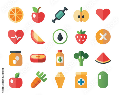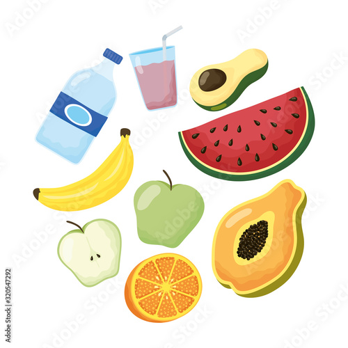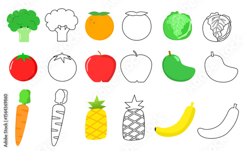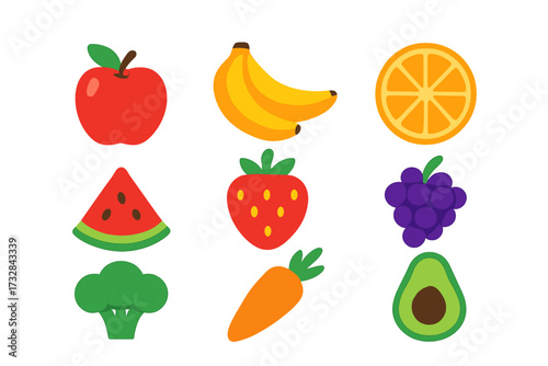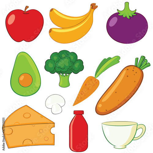 Vector food set. Meal and drink for lunch icon. Fast food and healthy menu with fruit and vegetables for diet breakfast illustration. Shopping trolley cart for grocery order, purchase and delivery