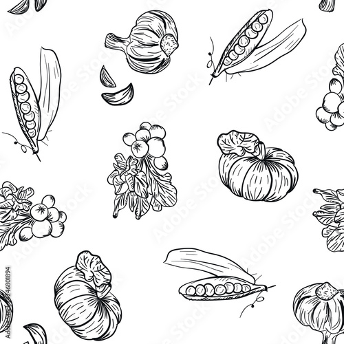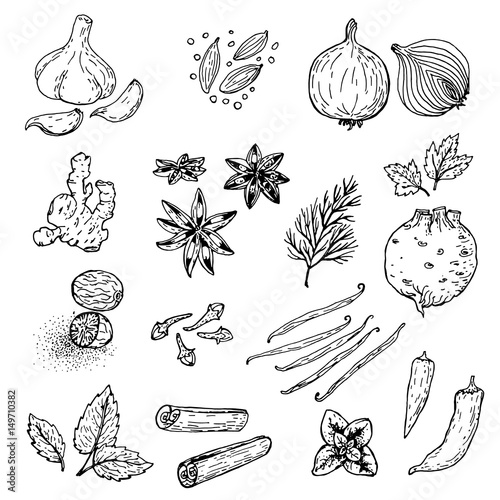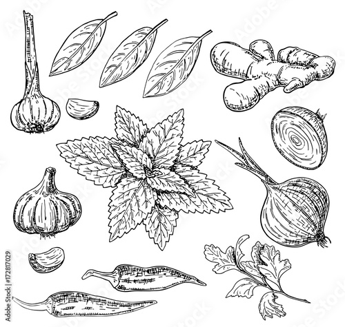 Vector ink hand drawn style set of culinary herbs and spices. Garlic, chili pepper, onion, ginger root, parsley, mint and bay leaves sketch illustration.