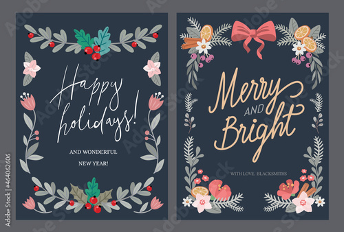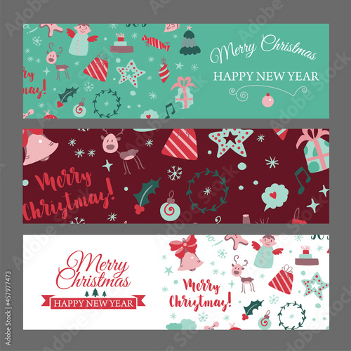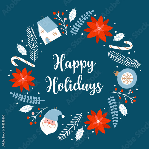 Vector Holidays seamless pattern with reindeers, gifts, snowmen, holly berries, balls, snowflakes, lettering. Decorative festive design element for Christmas greeting card, invitation, wrapping paper.