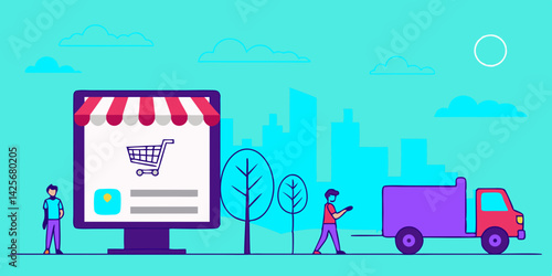 Vector ice-cream local street market flat illustration. Takeaway fast food shop isolated on white background. Public kiosk offering cold dessert for refreshment. Small business concept
