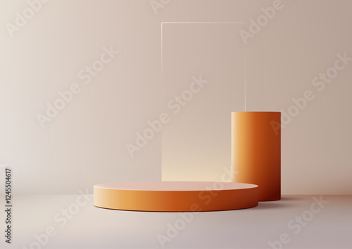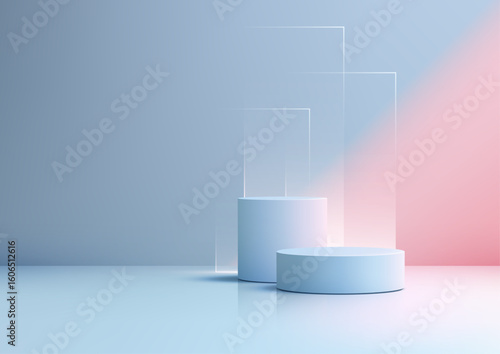White round podium with empty glass showcase illuminated by floor spotlights. Vector realistic illustration. Display case for presentation exhibition.