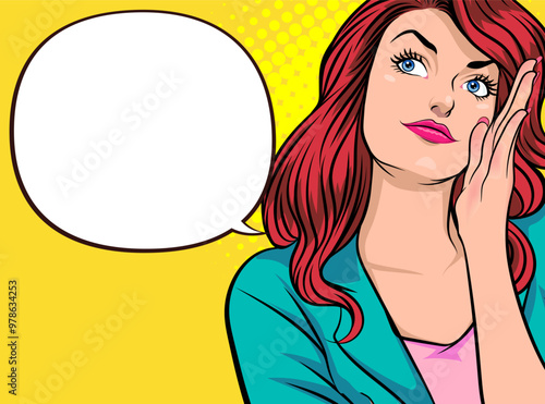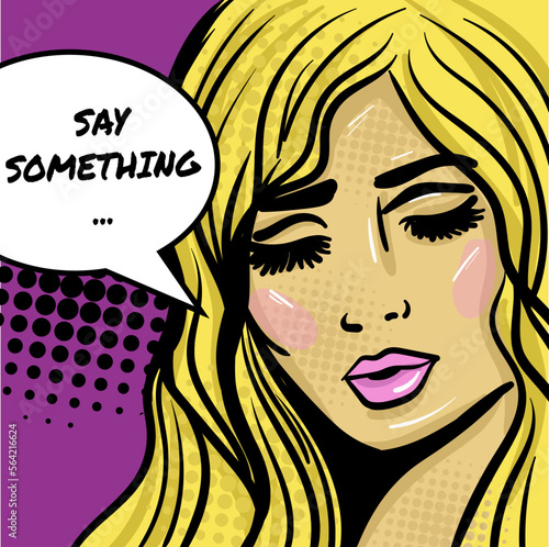 Vector illustration of beautiful blonde girl with long and wavy hair. Retro pop art comic style design element, template for beauty salon.