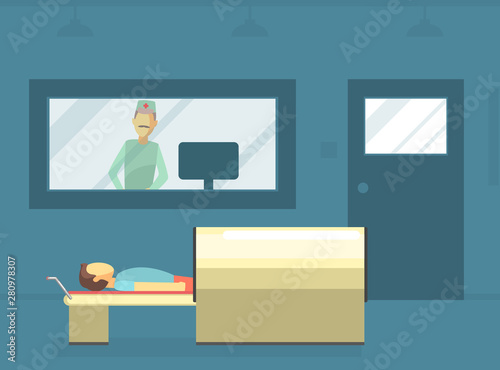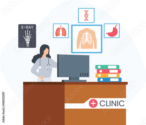 Vector illustration of archaeological laboratory, researcher scanning skeleton of dinosaur, figurines Ushabti. Artifacts research concept design element in flat style.
