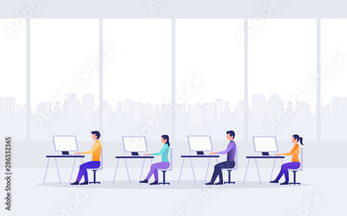 Vector illustration of bank office with manager, financial consultant and clients. People waiting in line for cash money. Banking concept design element in flat style