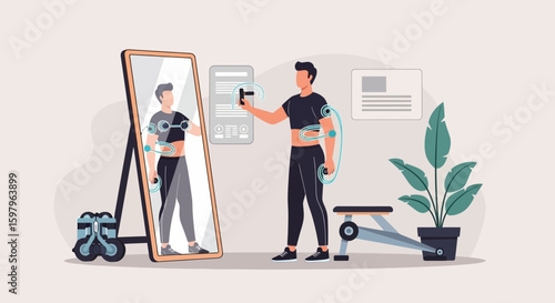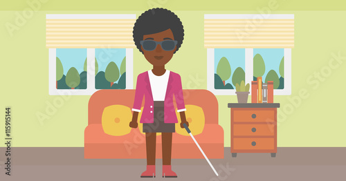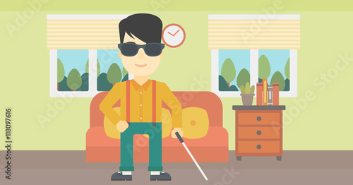 Vector illustration of disabled blind man with stick and guide dog waiting for green traffic light to cross street. Flat style design.